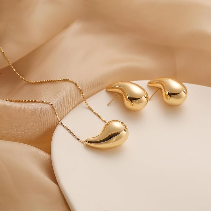 18K Gold Circle Earrings & Water Drop Necklace Set