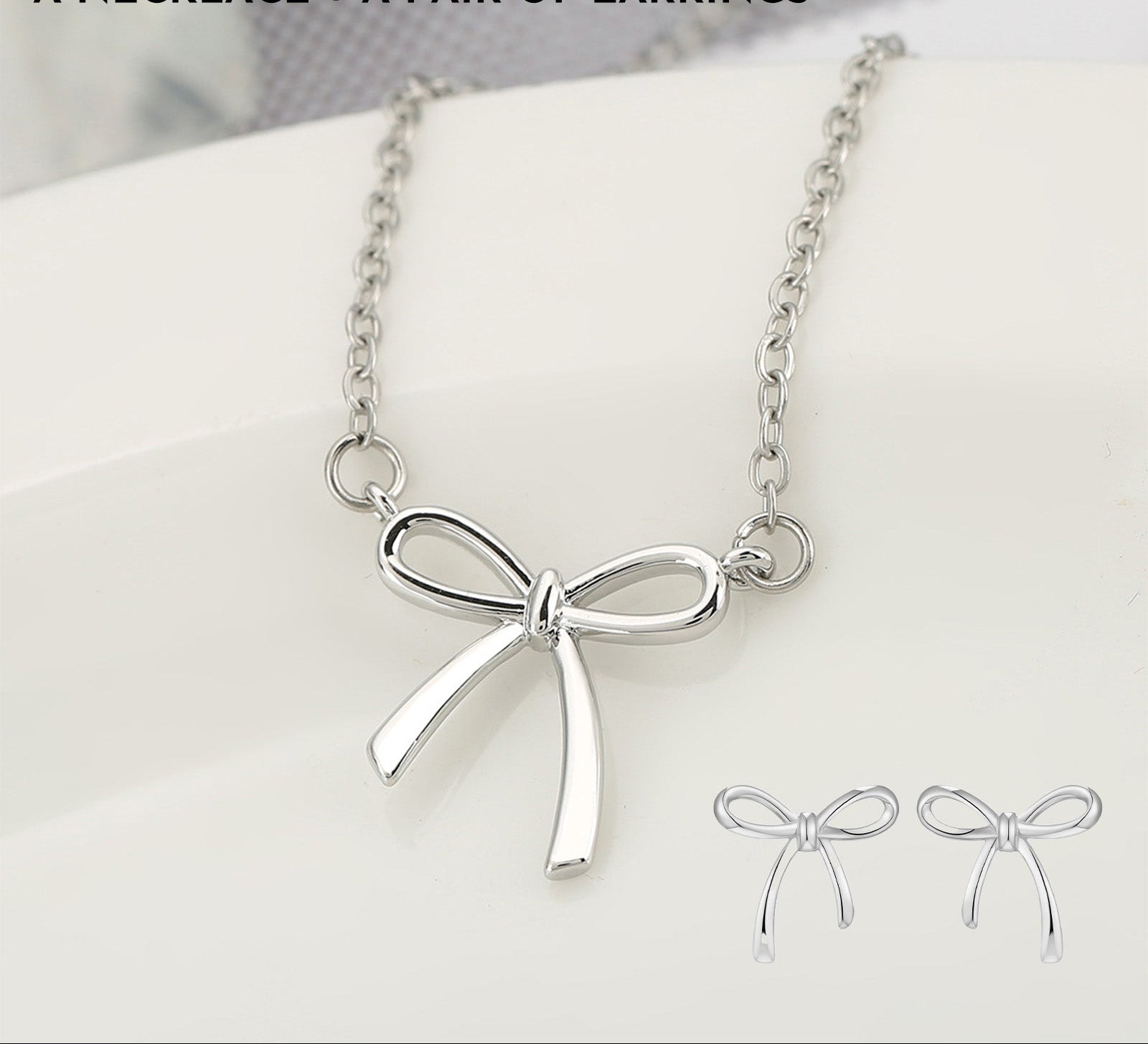 Crafted from high-quality brass and plated with 14K gold or sterling silver, the necklace and earrings offer lasting shine and durability. The minimalist bow design creates a cute yet classy vibe, perfect for layering or wearing solo. Whether for casual wear, date nights, or special occasions, this jewelry set adds a subtle sparkle that never goes unnoticed.